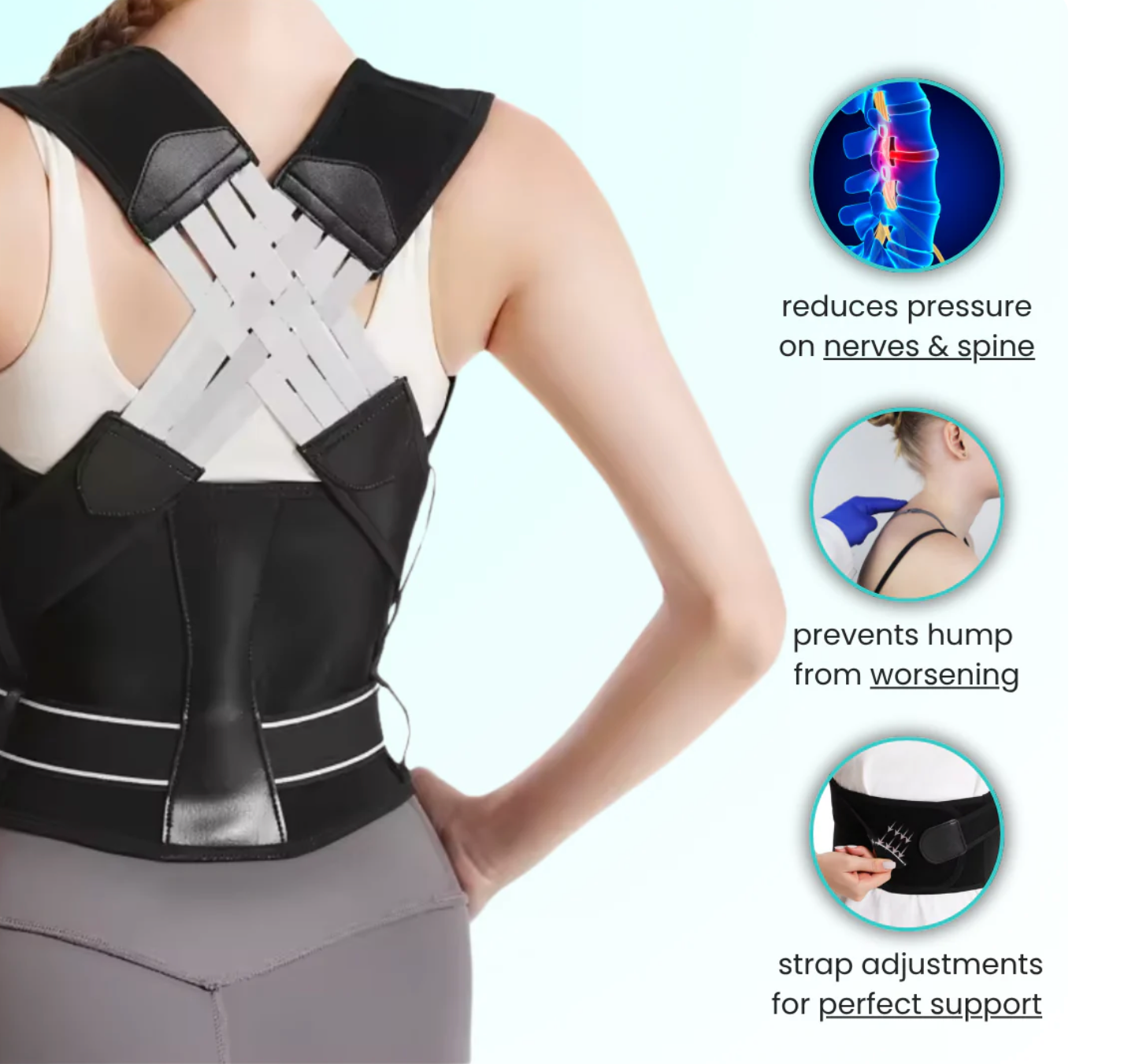 The double-strap design supports your upper and lower back while gently realigning your spine. This reduces nerve compression, improves mobility, and helps reverse the effects of long-term slouching - without restricting your movement.